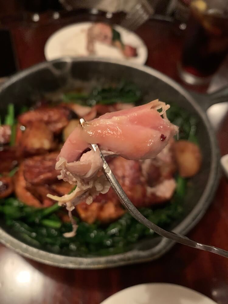 닭은 잘라져 있지 않습니다. 포크를 양쪽 손에 들고 직접 파해쳐야 합니다. 잘 익어서 살을 분리하는 데는 어려움이 없어요.